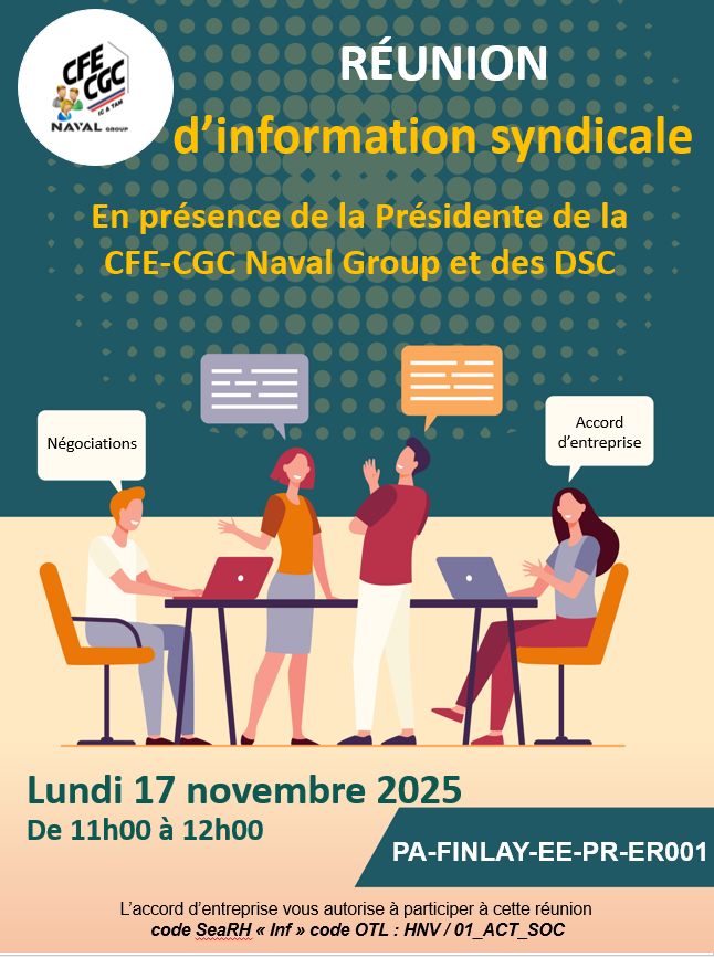 On vous fera un point sur l'actualité sociale en présence de la présidente de la CFE CGC Naval Group et des DSC